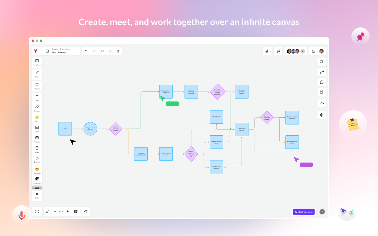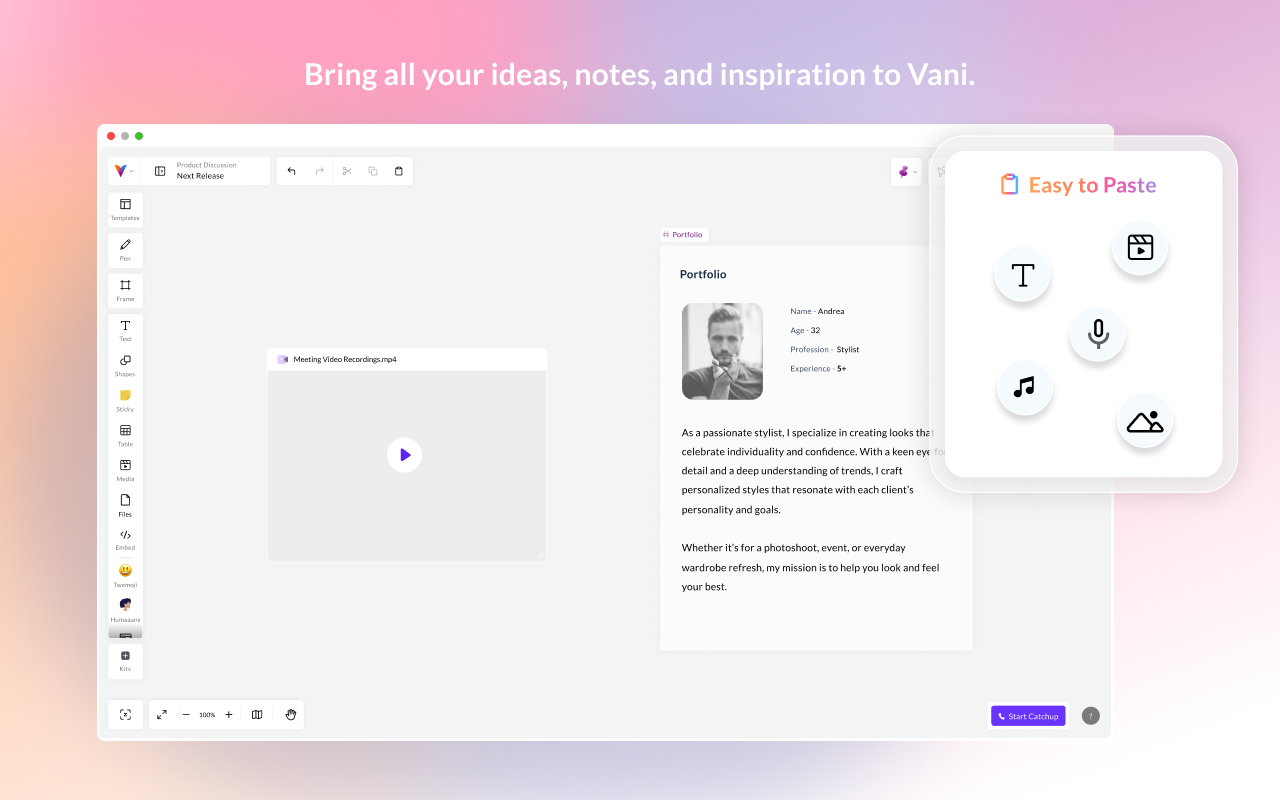 Vani incorpora Catchup, una potente función de videollamadas integrada que permite a los equipos mantenerse conectados y comunicarse de manera eficiente mientras colaboran en un mismo espacio virtual. Esta funcionalidad facilita la interacción en tiempo real, eliminando barreras geográficas y permitiendo que los miembros del equipo trabajen juntos sin interrupciones, como si estuvieran en la misma sala. Con Catchup, los equipos pueden organizar reuniones rápidas, discutir ideas en el momento, tomar decisiones en conjunto y resolver dudas sin necesidad de salir de la plataforma. Además, la integración con el lienzo de Vani permite que los participantes compartan visualmente su trabajo, tomen notas y realicen ediciones en vivo, optimizando la experiencia de colaboración. Al contar con comunicación instantánea dentro del entorno de trabajo, Vani no solo mejora la productividad, sino que también fortalece la conexión entre los miembros del equipo, fomentando una cultura de trabajo más dinámica, eficiente y alineada. No importa la ubicación de cada persona: con Catchup, la distancia deja de ser un obstáculo para la creatividad y la innovación.
